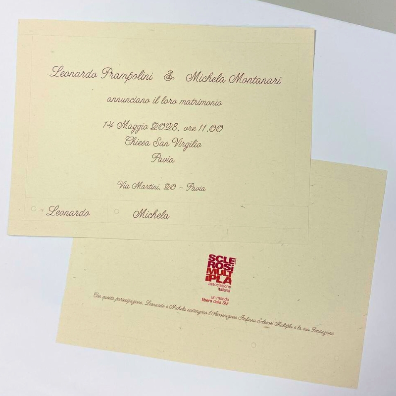 Queste partecipazioni non sono solo un dettaglio del tuo matrimonio. Scegliendole, sostieni la ricerca sulla sclerosi multipla, aiutando chi lotta ogni giorno contro questa malattia. Un piccolo gesto che può fare una grande differenza.