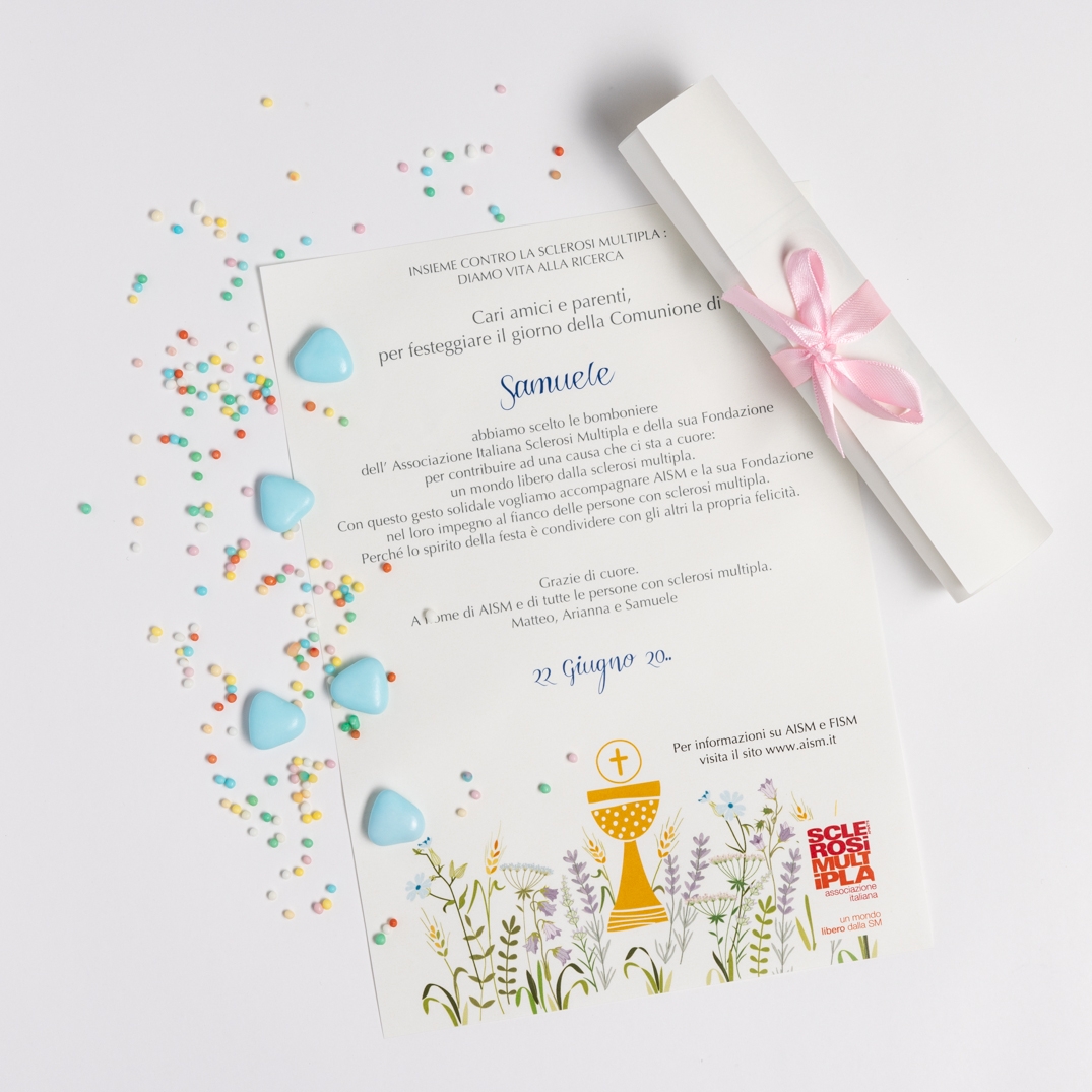 Cerchi un modo speciale per celebrare la Comunione per fare un regalo che vada oltre il semplice oggetto? La Pergamena Solidale Comunione Fantasia è perfetta per chi vuole festeggiare un momento unico, dando allo stesso tempo un contributo concreto alla ricerca sulla sclerosi multipla.