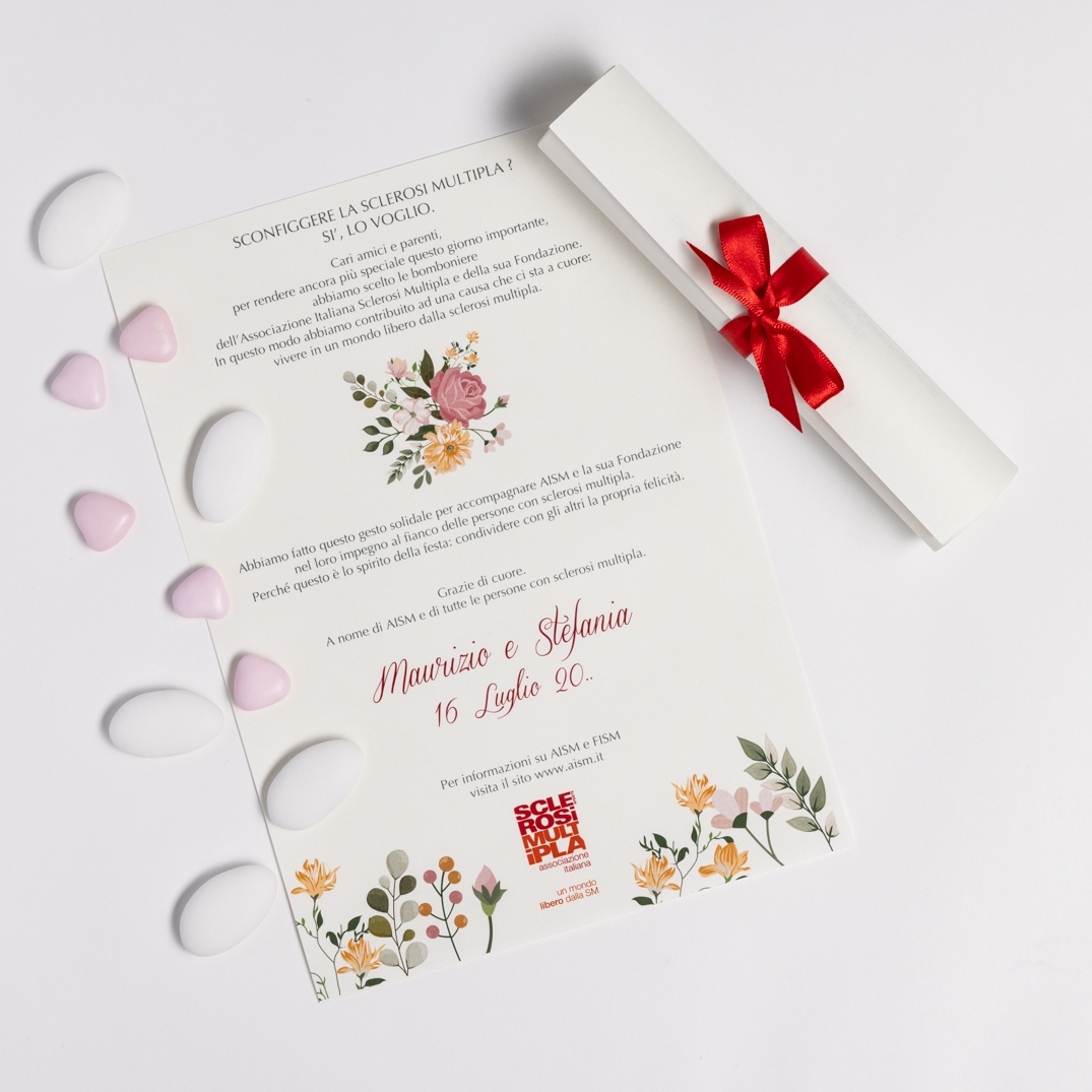 La Pergamena Solidale Matrimonio Fantasia, con nastrino rosso, è il regalo perfetto per celebrare il tuo matrimonio con stile. Personalizzabile con nome e data, sostieni la ricerca sulla sclerosi multipla con un gesto d’amore che fa la differenza.