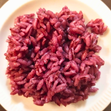 • Un’esplosione di colore: aggiungi un ingrediente acido in cottura (succo di limone, aceto di mele o vino bianco) e il riso si trasformerà in una splendida sfumatura rosa-viola! 🎨